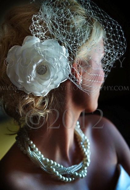 Bespoke ivory silk flower birdcage veil created for Sophie, with a diamante brooch centre to match the buttons down the back of her beautiful dress: