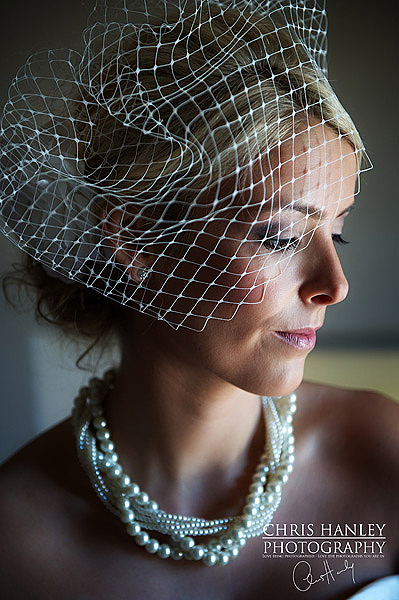 Bespoke birdcage veil made for Lucy with diamante centred flower to highlight the sparkle on her dress, and goose feathers to match her gorgeous shawl: