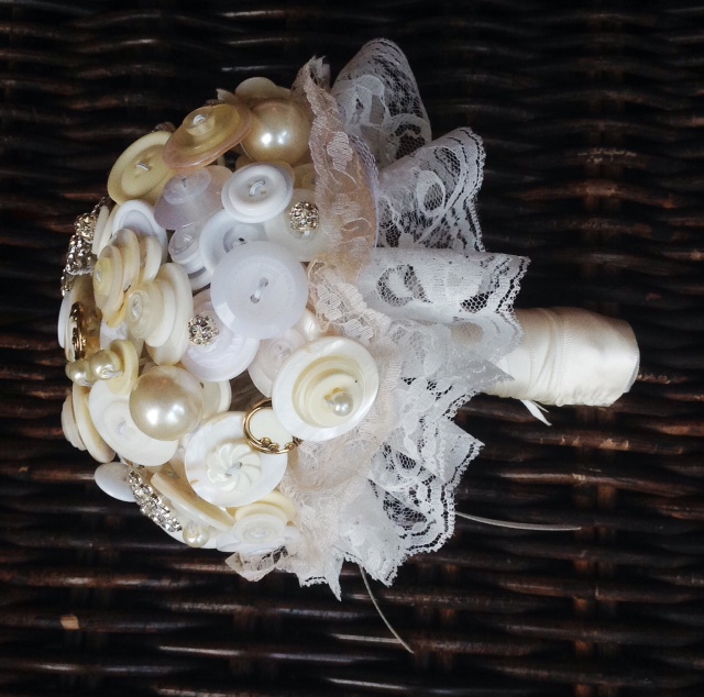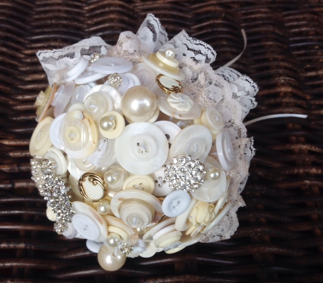 Bridal Button Bouquets are increasingly popular with brides who want to have a real keepsake as part of their weddings. They are very versatile and can come in different sizes, shapes, colours and style and can be made exactly as you want them. They can be made to fit in with your wedding colour theme, including any buttons or broaches that you may have – perhaps something passed down to you from your parents or grandparents, or just a favourite button or piece of jewellery that you have. They can include buttons, beads, brooches, jewellery, fake or real flowers, ribbon, satin, lace – the choice is yours.