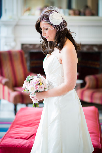 We are delighted to have received some gorgeous photos from a beautiful bride Gemma for who we recently made a bespoke birdcage veil to match her Sophia Tolli dress. Gemma first contacted us when she had tried her dress on in the lovely Lily and Lace boutique in Edinburgh. She had seen one of our similar designs in the Edinburgh based bridal shop but wanted something to perfectly match her dress for her wedding in the grand Balmoral Hotel in the heart of Edinburgh.