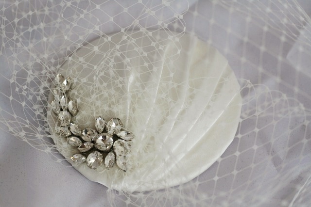 Gemma wanted the headpiece to be made from the excess fabric from her dress so that the material matched perfectly and gathered to reflect the ruching on the Sophia Tolli dress. She also wanted the stunning diamante and bead detail from the gathered point the dress to be mimicked in the birdcage veil design.