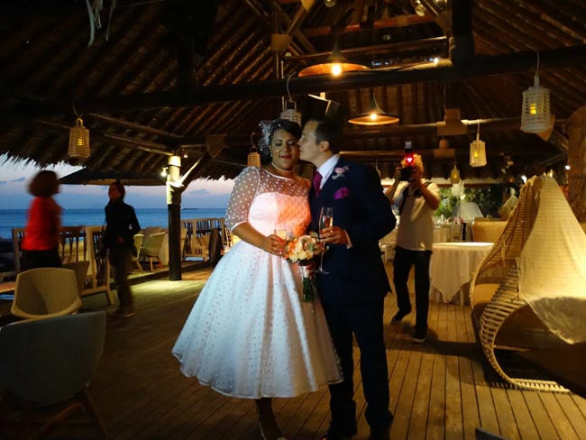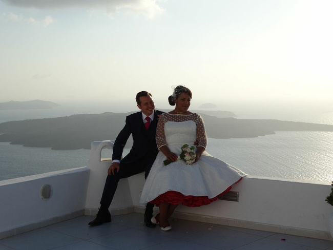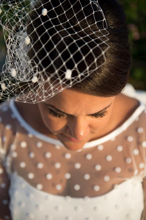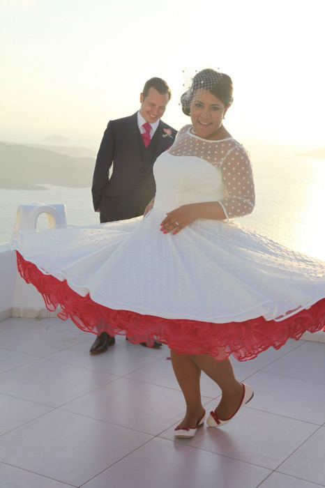 We are delighted to have received some photos from the gorgeous Nicola for whom we designed a birdcage veil to go with her fabulous polka dot 1950s ivory tea-length wedding dress in her romantic Greek wedding.