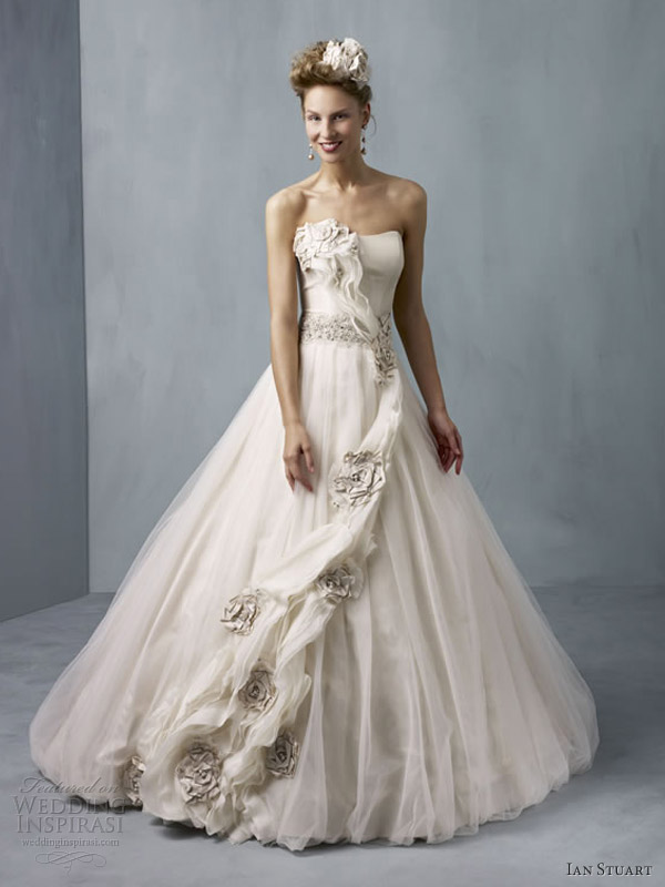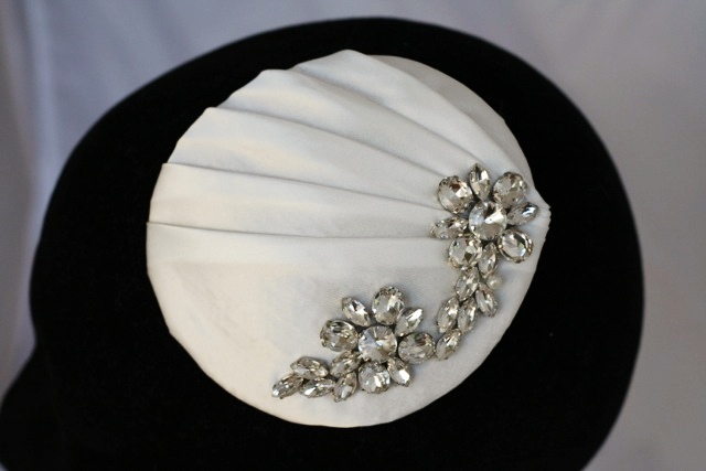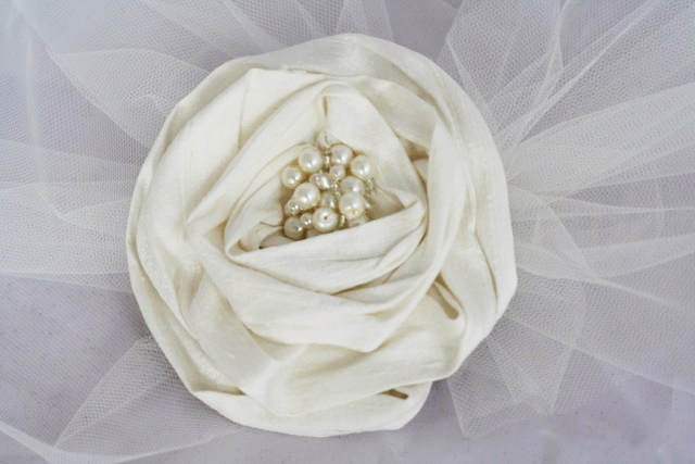 We have also been making a custom design to match a bride’s dress. This bride-to-be has the stunning Ian Stuart 2013 – Supernova – Cassiopeia silk dupion dress with flowers flowing down the front so we created a silk dupion flower with pearl and silver beading to match, to be worn with a tulle birdcage veil: