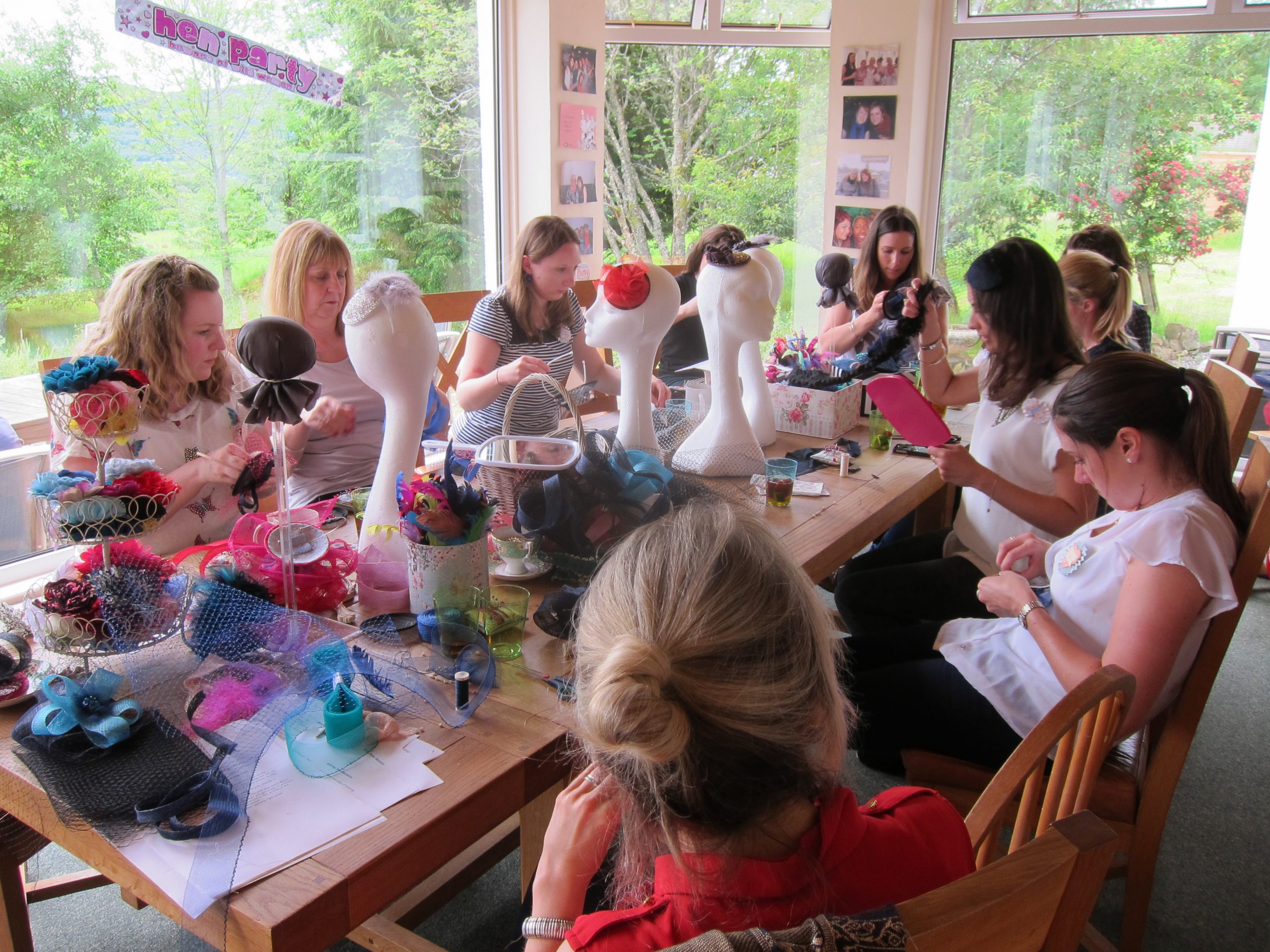 We had a wonderful time running a fascinator making class for Steph’s hen party up in Perthshire, on the banks of Loch Tay recently. The ladies had rented a stunning house for the weekend, with views across the loch, and the sun was shining for the whole day whilst they created their gorgeous fascinators. For details of the afternoon and more photos of the ladies and their lovely headpiece creations, see our blog post on our sister site www.fascinatormakingclasses.com