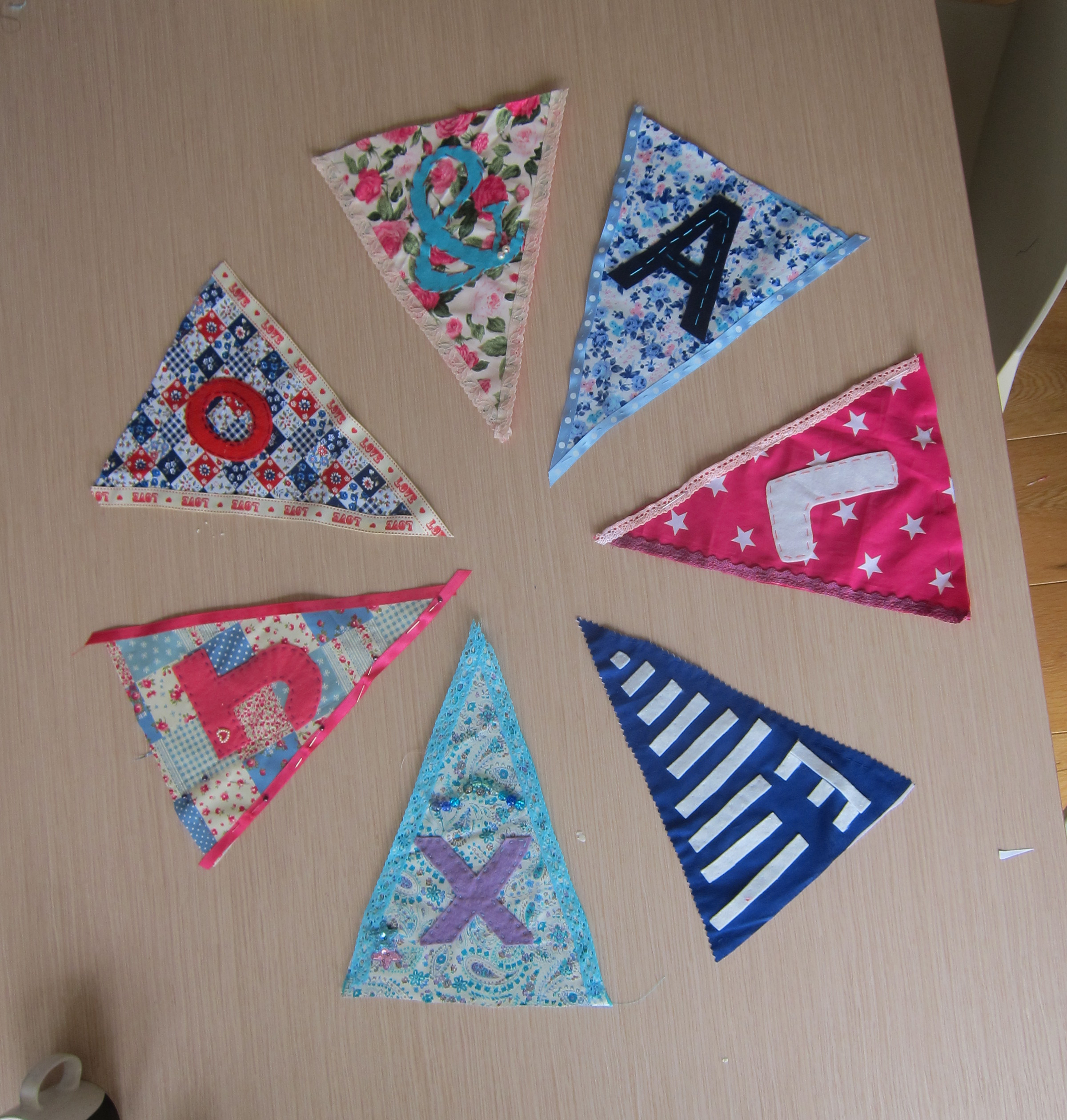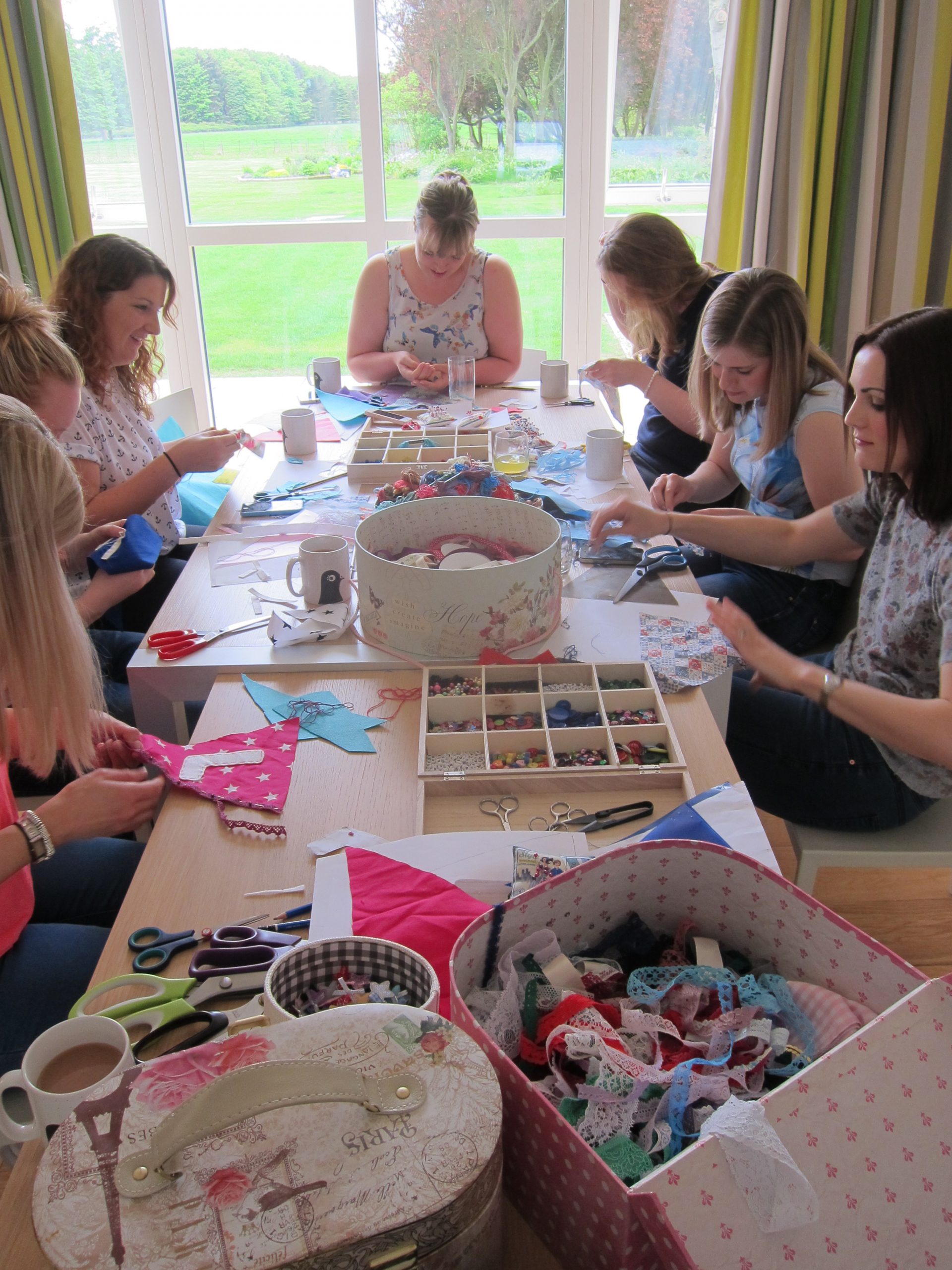 We had a great time a couple of weeks ago running a bunting making workshop as part of the lovely bride-to-be Jo’s hen party. The girls were staying at the fabulous Treescape in the East Neuk of Fife so we enjoyed beautiful surroundings as we got creative before lunch! Fuelled with plenty of tea, coffee and cakes, the girls had a great time making some beautiful bunting for Jo. Here are some snaps of the girls hard at work and of the finished product!