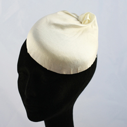 We have just added 3 new lovely fascinators and bridal cocktail hats to our range.  First of all Violet – a stunning hand-made silk covered pillbox hat, with a very elegant twist. This can be worn on its own or with a birdcage veil. You also have the option of adding additional detail to it – some lace, pearl or feather. Just contact us if you are interested in this.