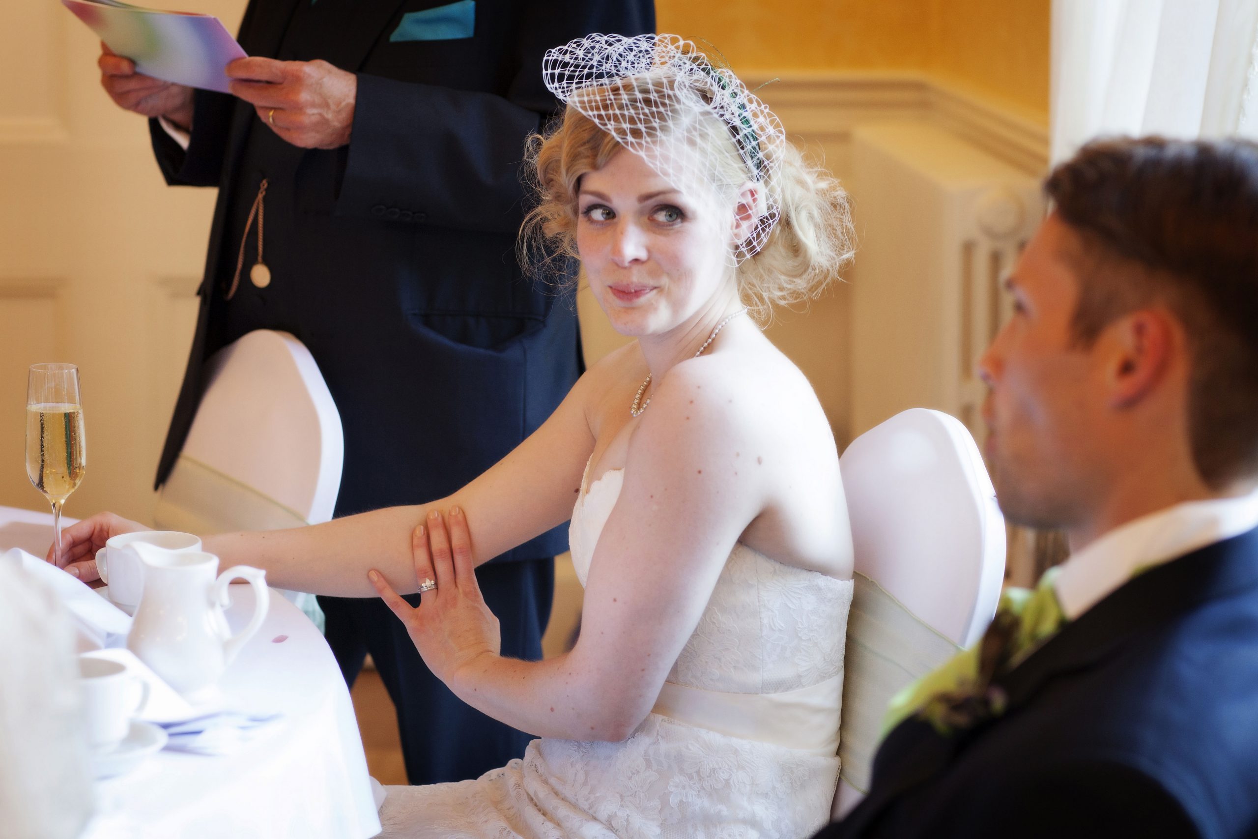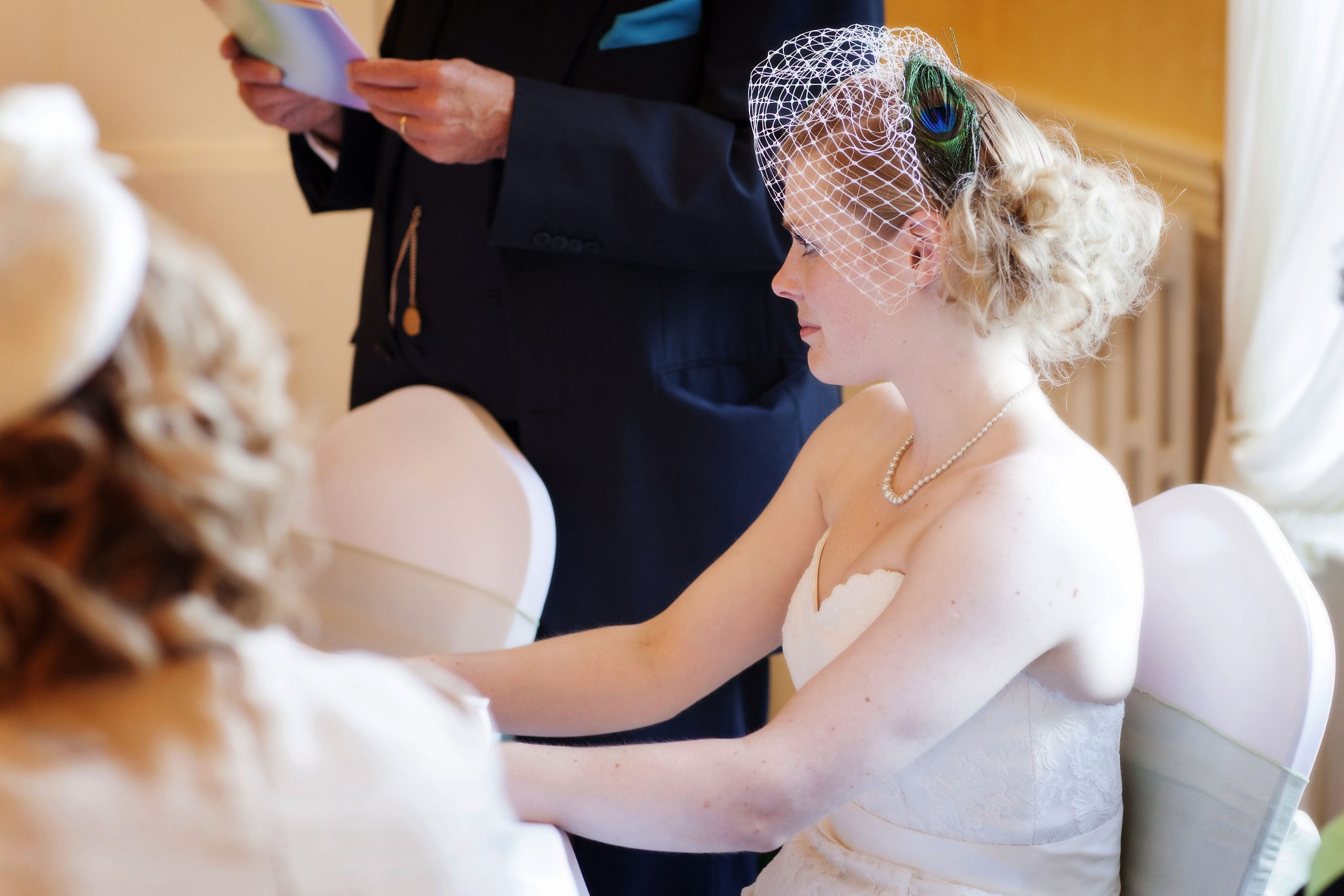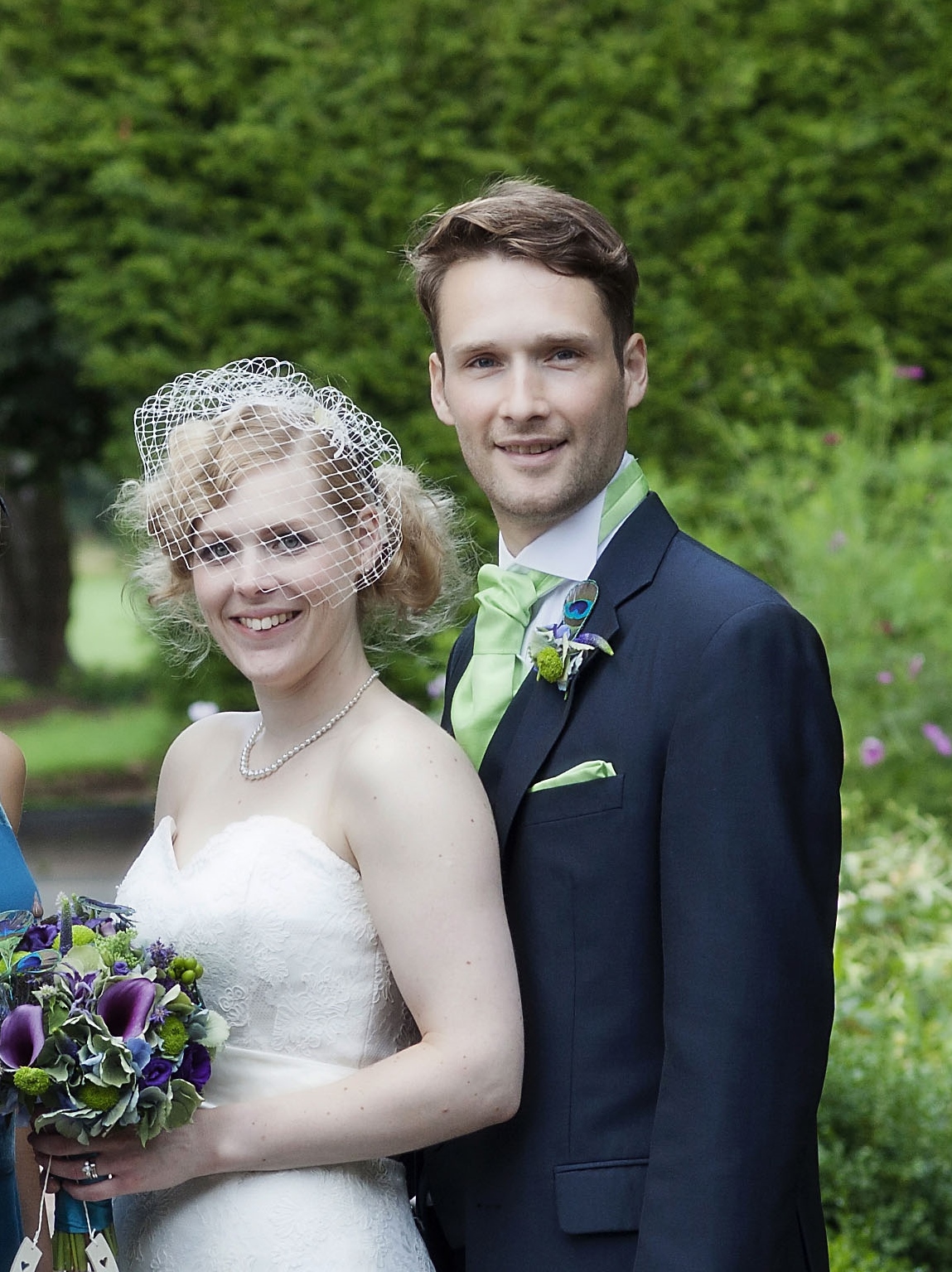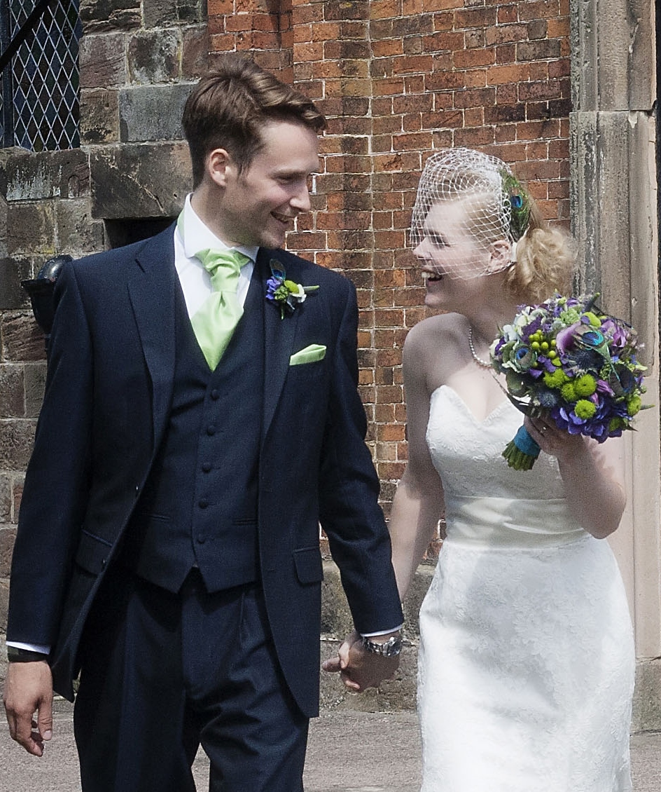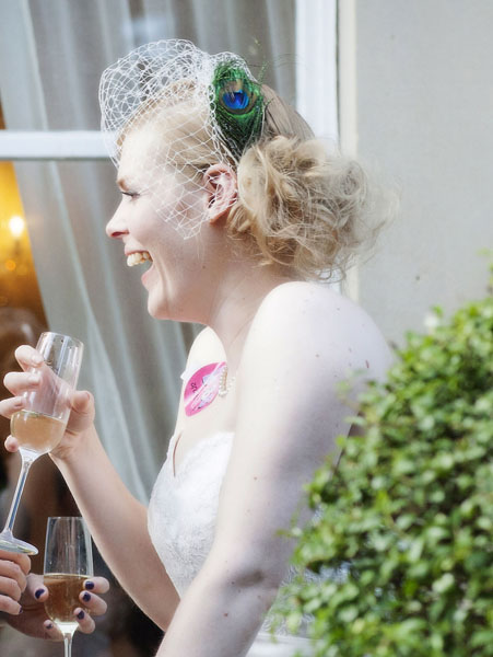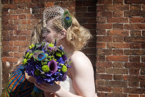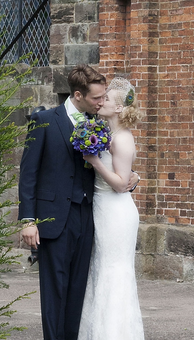We have just received some lovely photos from a customer of her wearing her bespoke birdcage veil which Arabella Bridal made for her wedding earlier this year. Leanne’s wedding colour scheme was very colourful with beautiful lime green, teal, blue and purples as well as peacock feather embellishments. We used ivory russian veiling for her veil and the body in this veiling allowed Leanne to play with how she wore the veil and on the day she actually wore it two different ways for different parts of the day. This is a great idea and shows how versatile a birdcage veil can be. We used some real peacock feathers, emerald green ribbon and crystals to create the detail for her which tied in with her colour scheme and her fab green shoes.
