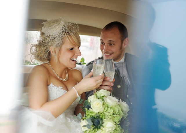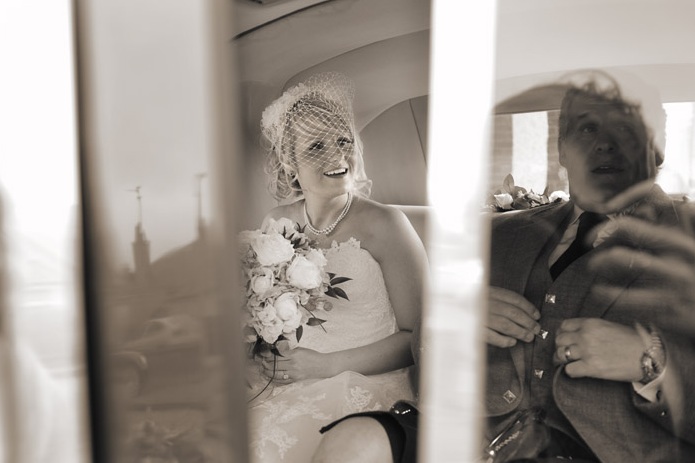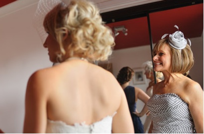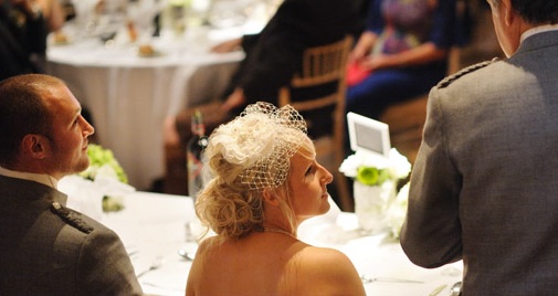 After the ceremony, Pamela cleverly transformed her birdcage veil into a lovely bridal evening wear fascinator by tucking up the veil – demonstrating the versatility of the birdcage veil and providing a glamourous, striking and elegant headpiece for the wedding reception.