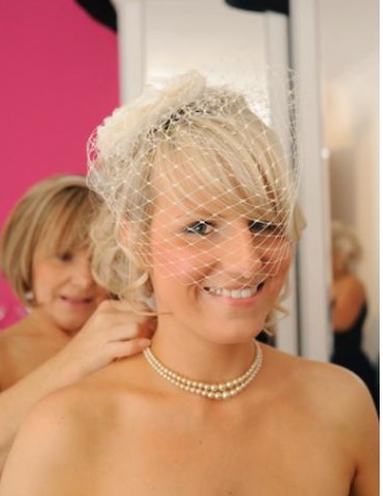 I was recently in contact with a past customer who had a bespoke birdcage veil made to wear with her gorgeous Benjamin Roberts dress and she has very kindly agreed to let us post some photos to show off the end result. As you will see, Pamela looked absolutely stunning on her big day. This was actually a double job for us as we also created a bespoke fascinator for her mum to wear with her stunning Ian Stuart dress – resulting in a beautiful bride and mother-of-the-bride!