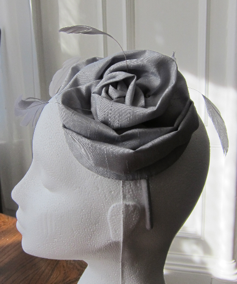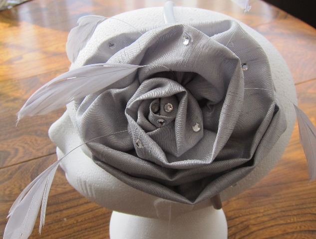 Her mum’s silver grey fascinator combines satin silk, feathers and crystals.