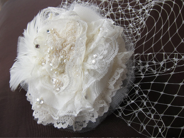 Pamela’s birdcage veil was made using ivory Russian netting, a variety of vintage lace, feathers with pearl and Swarovski crystal detail.