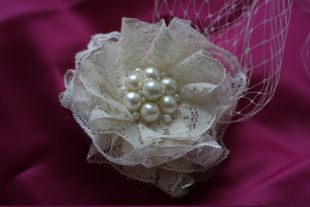The embellishments at the side use vintage lace as a backdrop to pearl daisy design, to match Fiona’s engagement ring. The bandeau netting was made slightly shorter than usual so that it could sit at the back of her head.