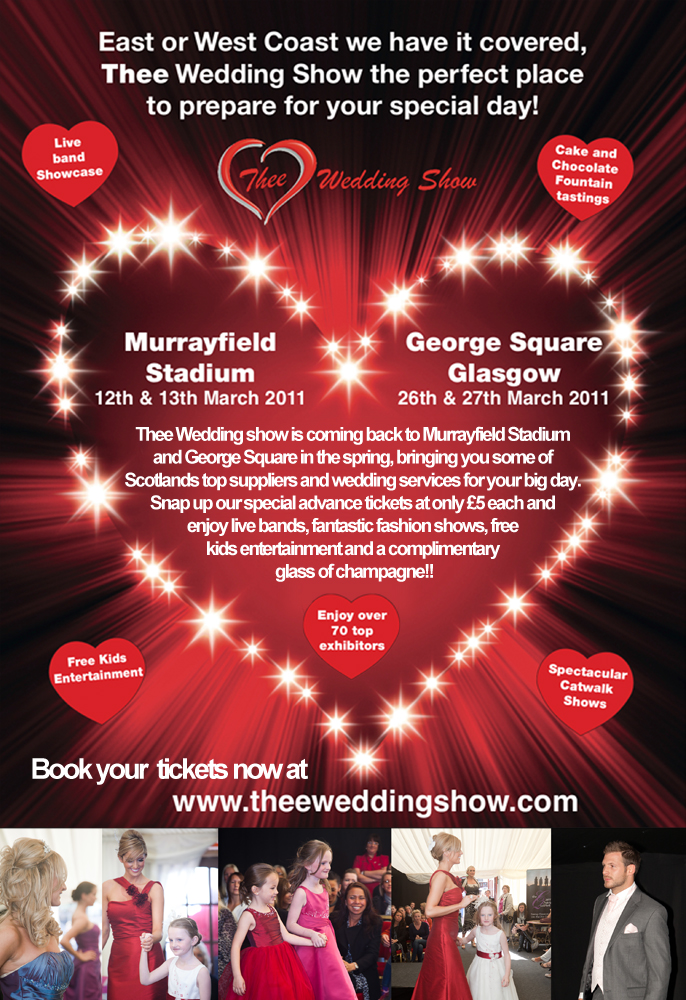 It’s come around quickly and only 2 more sleeps until the big day! Thee Wedding Show at Murrayfield Stadium, Edinburgh takes places this weekend the 12th and 13th March 2011 from 10 – 4 on both days. With loads of great exhibitors, freebies, catwalk shows and tons of inspiration, all you brides-to-be get yourself along to it!!